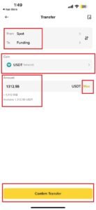 Transfer এর সময় অবশ্যই From: Spot এবং To: Funding এ থাকতে হবে। কয়েন হিসাবে USDT সিলেক্ট করতে হবে। আপনি যদি সম্পূর্ণ ডলার ট্রান্সফার করতে চান তাহলে Max. এ ক্লিক করুন। তারপর “Confirm Transfer” এ ক্লিক করুন।
